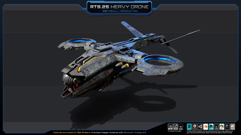 Set of one RTS.25 - Heavy Drone (FBX model). Separated parts: weapons, engines, sensors (NO landing gear included). No animated parts, FX, script or LOD. Check all previews, descriptions and video for full details before buying. (HANGAR in video and previews is NOT included, its just for Artistic purpose).